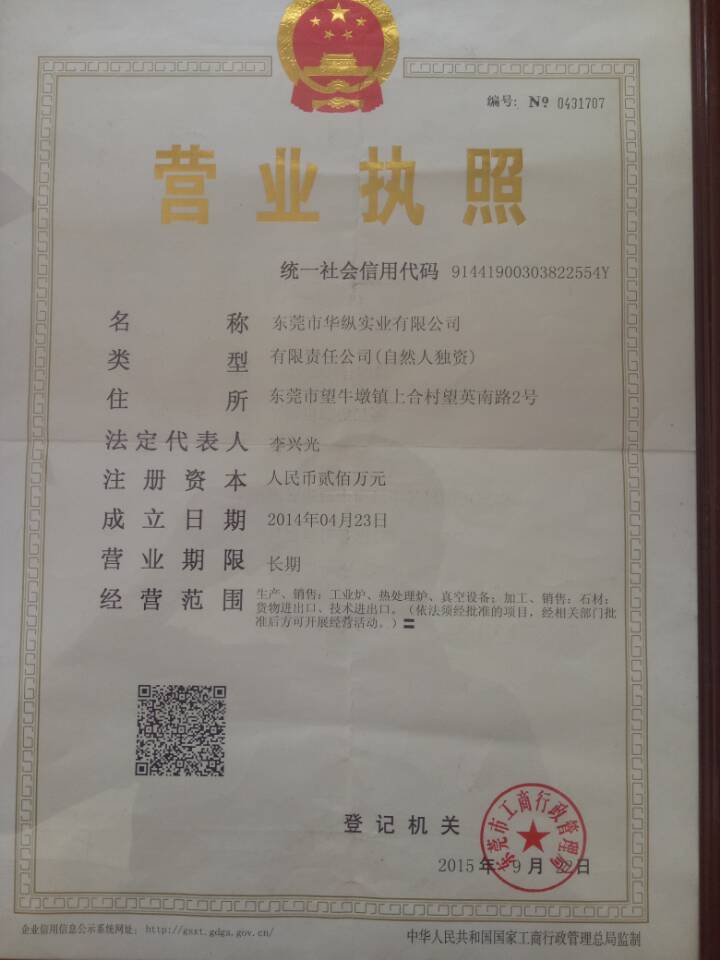 证书介绍 东莞市华纵实业有限公司创建于九十年代,是一家集工业电炉、石材电解炉等设备的设计、研发、生产、销售为一体的综合性集团公司,下设机电设备公司、电炉制造厂、石材加工厂等多家分司。产品远销欧州、南美、北美、非州、亚州大部分国家和地区,并以技术强、性价高、交货快、售后优而备受国内外客户的青睐。